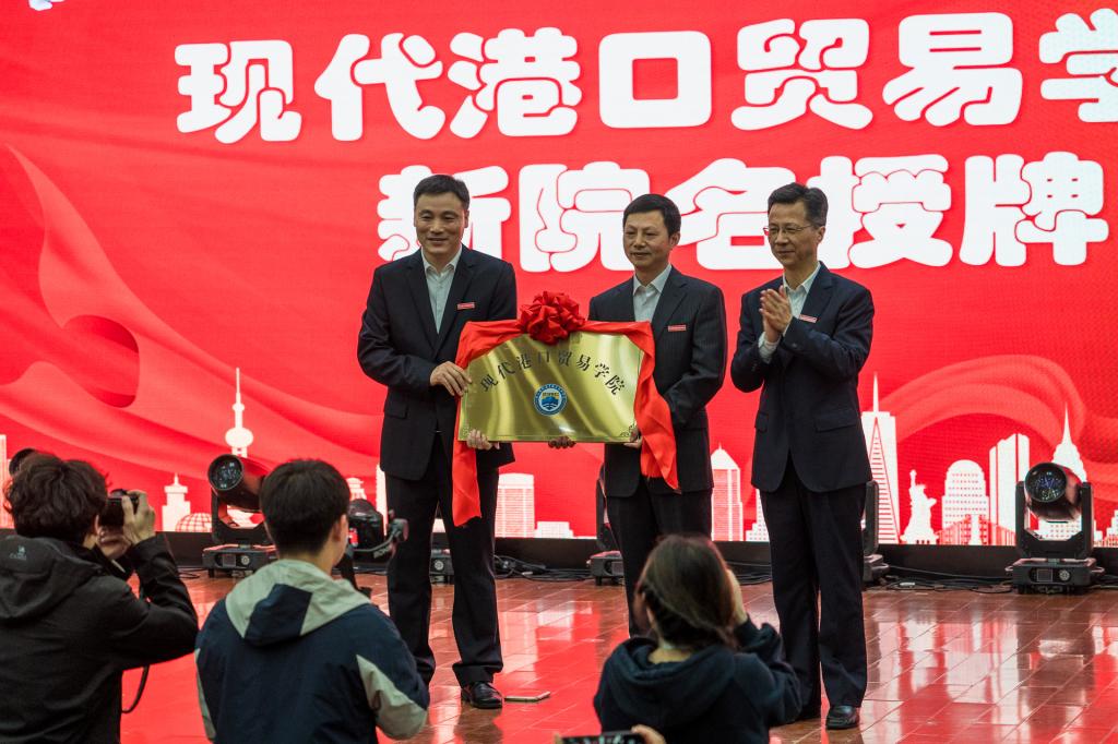 随后,苏为泽书记、吴中平校长、夏志刚副校长和学院院长王贵斌、党总支书记吴平波以及嘉宾代表共同启动了“现代港口贸易学院”新院名,标志着港口管理学院正式更名现代港口贸易学院。